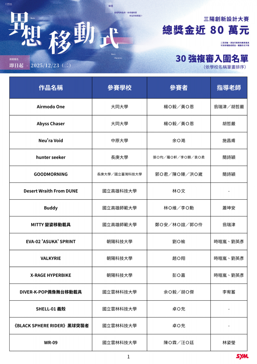 複審入圍名單將在「SYM 三陽創新設計大賽」比賽官網公布,並以電子郵件另行通知個別入圍複審之隊伍。